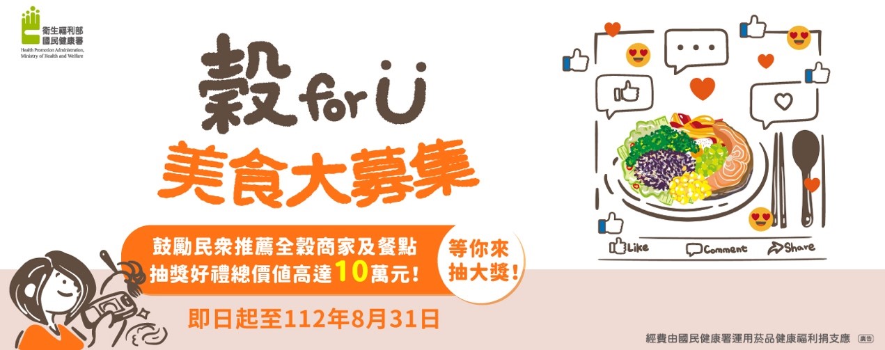 | 二、 | 衛生福利部國民健康署為鼓勵民眾多攝取全榖及未精製雜糧,並落實均衡飲食的健康生活型態,辦理「穀 for U、天天好穀糧」健康飲食採購系列活動,活動網址為https://reurl.cc/o7AnpD,請鼓勵所屬踴躍參加。 |