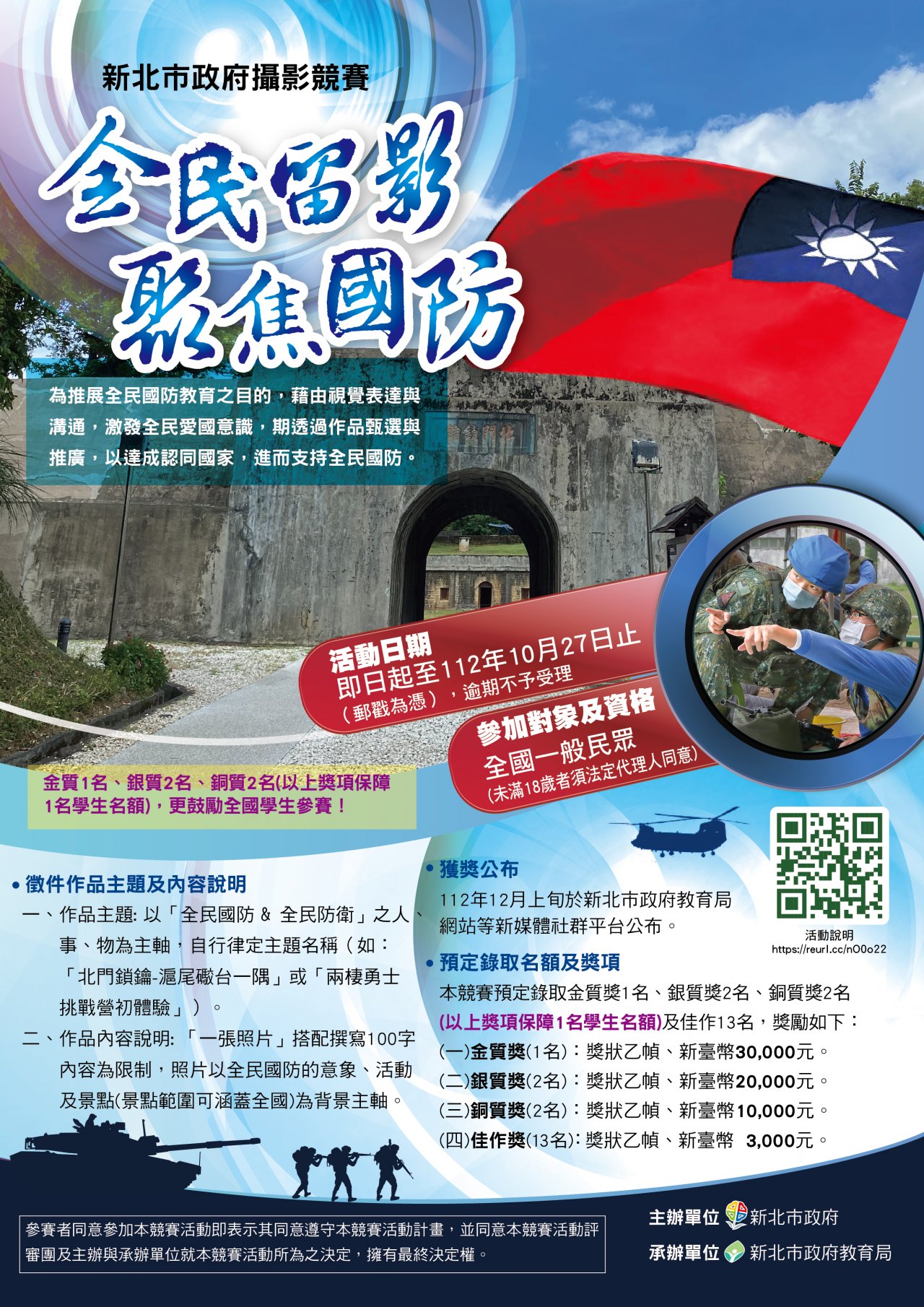 | 主旨: | 有關新北市政府《全民留影‧聚焦國防》攝影競賽活動,請協助宣導鼓勵參與,請查照。 |