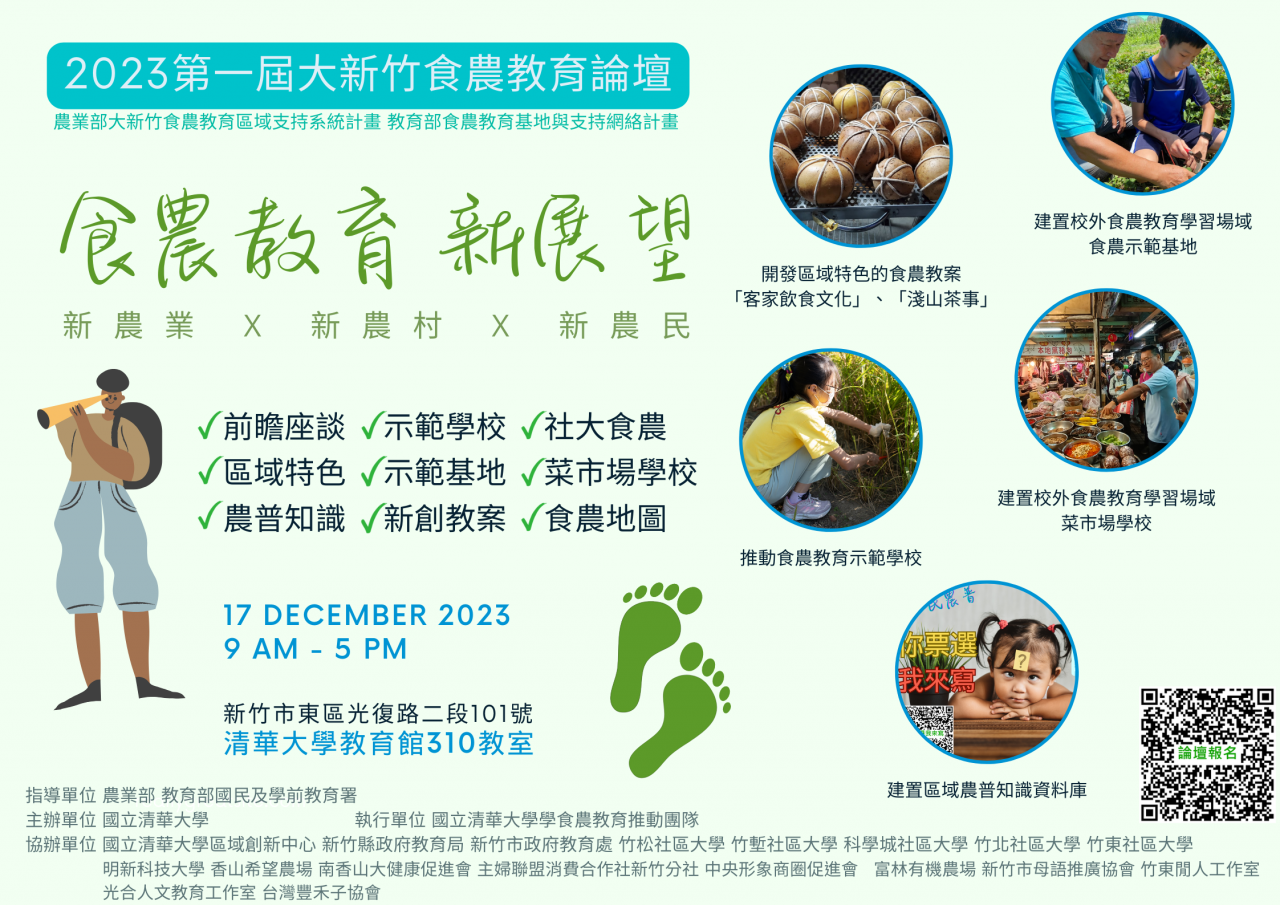| 二、 | 國立清華大學辦理「112年食農教育基地與支持網絡計畫」,透過旨揭論壇盤整過去數月發展區域特色食農教案、食農示範基地建置及示範學校(包括中小學及社區大學)資源、同知菜市場學校建制與教案研發、食農地圖與資源網絡前置作業,與在地農普知識庫作分享等成果發表,並邀請所有與會者共同尋思討論、擘畫食農與農食的未來想像,相關資訊如下: |