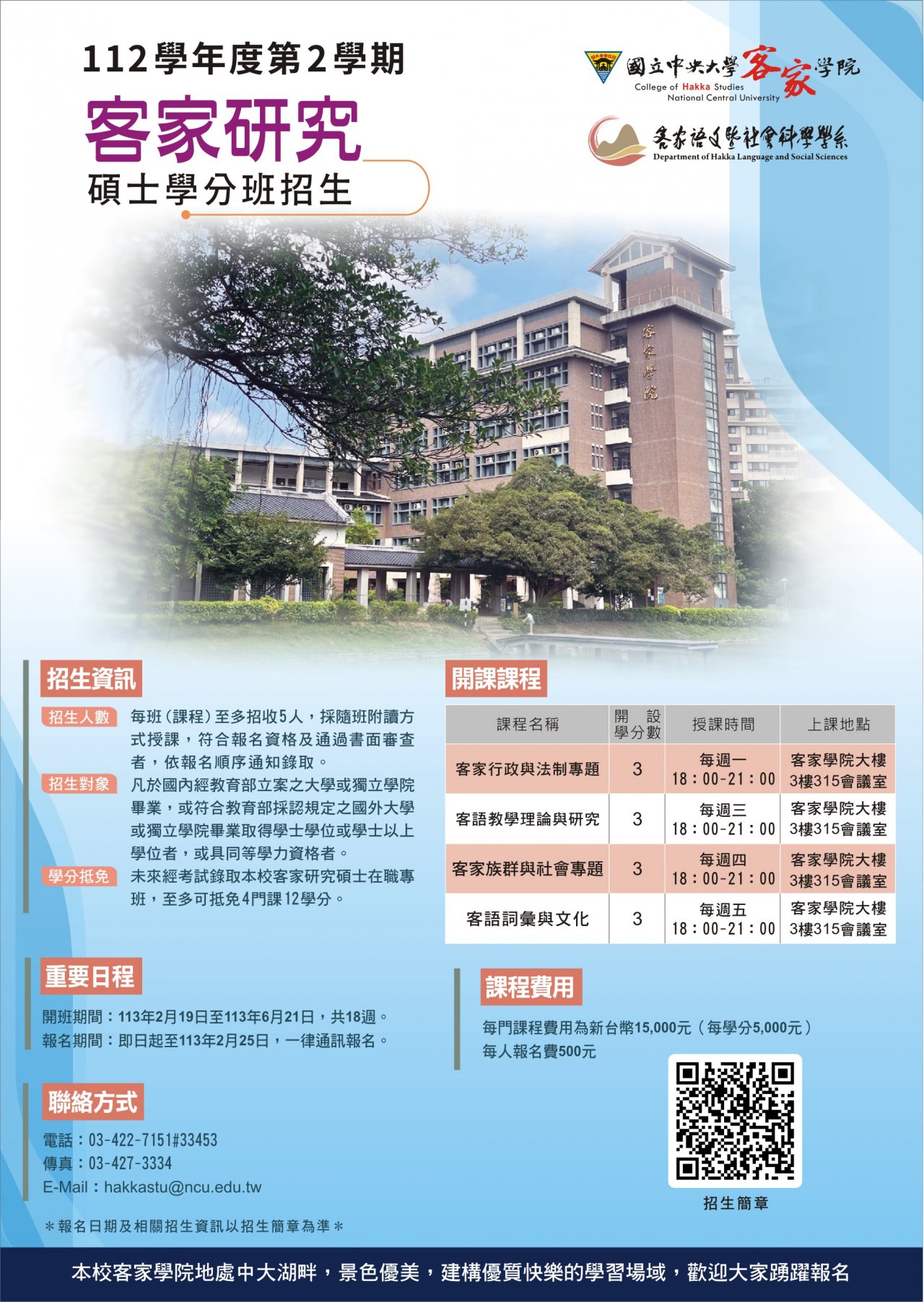| 五、 | 112學年度第2學期「客家研究碩士學分班」招生簡章,請至本系網頁->最新消息->招生公告->下載http://hakkadepartment.ncu.edu.tw/web/news/news_in.jsp?np_id=NP1705731398283。 |