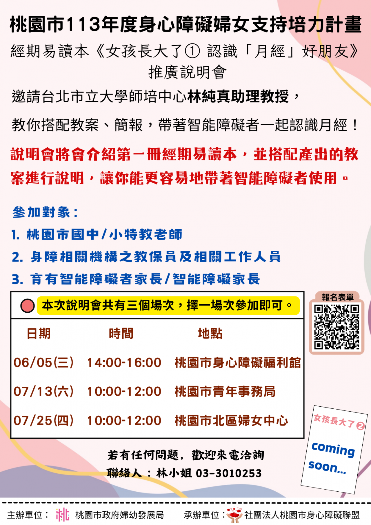 二、 為提升智能障礙女性資訊近用權,本府婦幼發展局委託社團法人桃園市身心障礙聯盟針對智能障礙女性月經議彙編經期自我照護手冊易讀版,並辦理該手冊推廣說明會,以促進本市相關專業人員及智能障礙家長對手冊操作及使用的認識,請貴校踴躍報名參加,旨揭說明會辦理時間、地點如下: