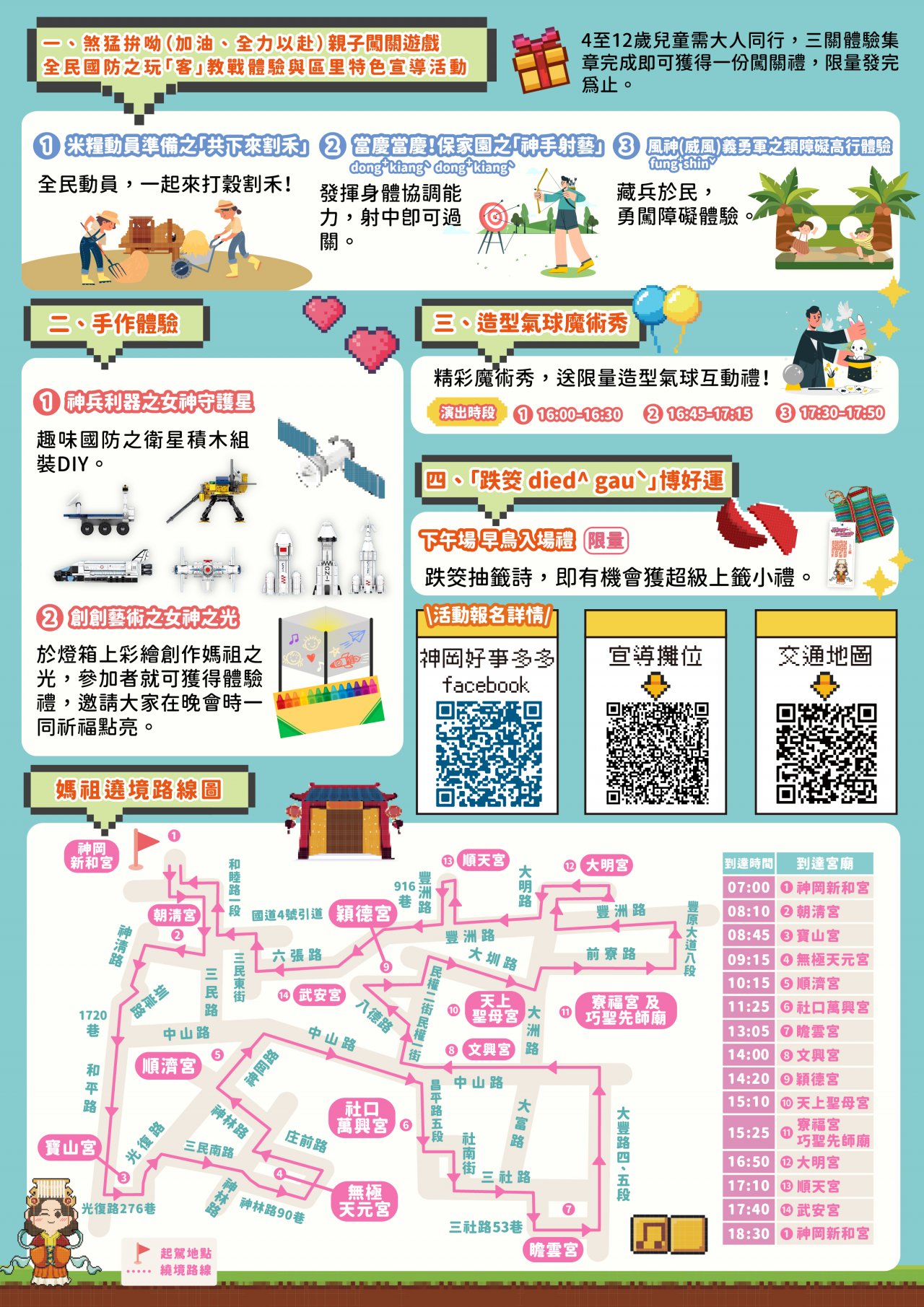 (二)活動結合全民國防、神岡客底文化及媽祖信仰等3大元素,打造下午場主題活動-煞猛拚呦(加油、全力以赴)!全民國防之玩「客」教戰體驗暨區里特色宣導活動,包含親子闖關、手作及共創藝術體驗、秘密小活動「跌筊died^ gauˋ」博好運等單元。