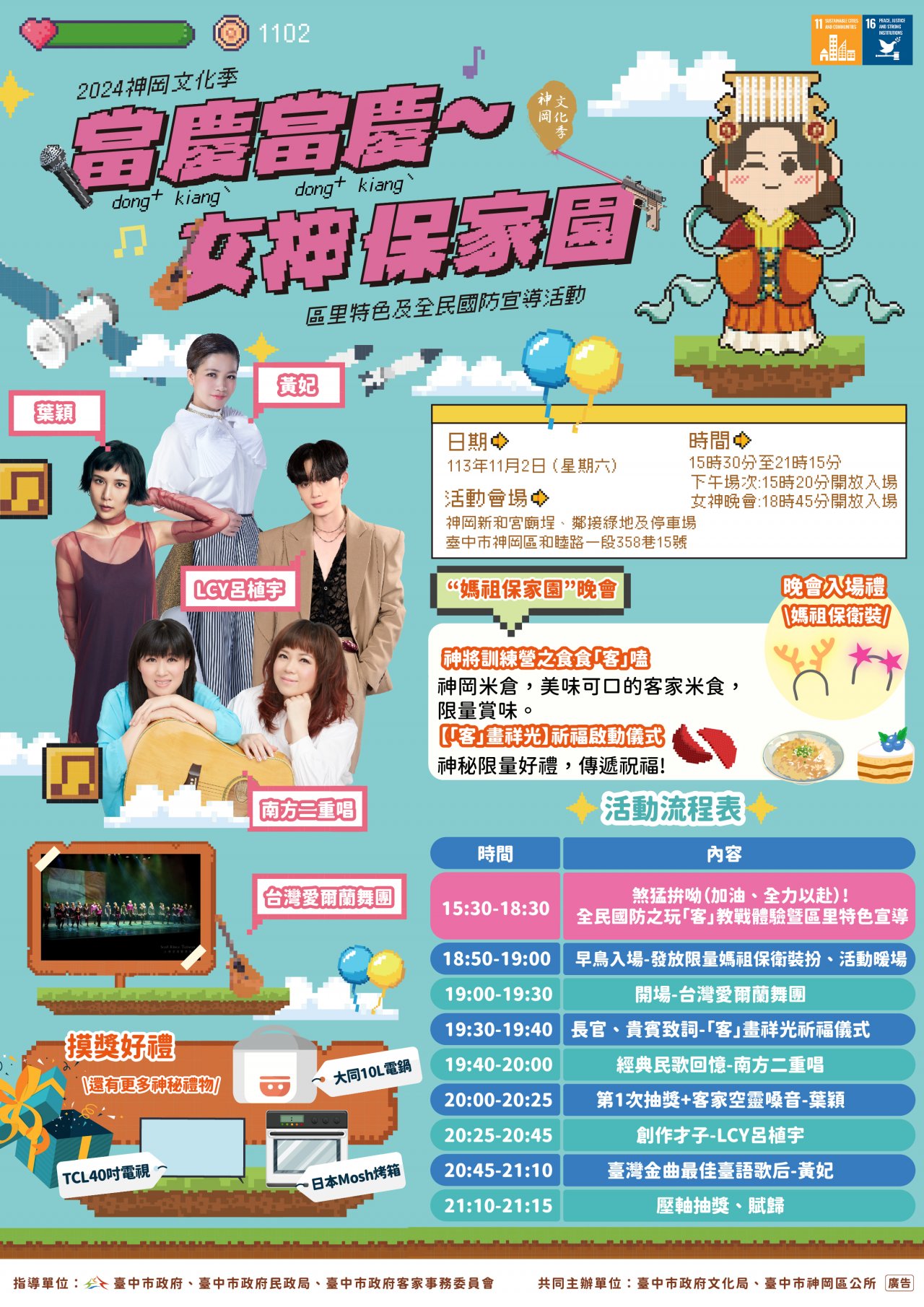 二、2024神岡文化季壓軸篇章【當慶當慶~女神保家園】區里特色及全民國防宣導活動,詳細資訊如下:
