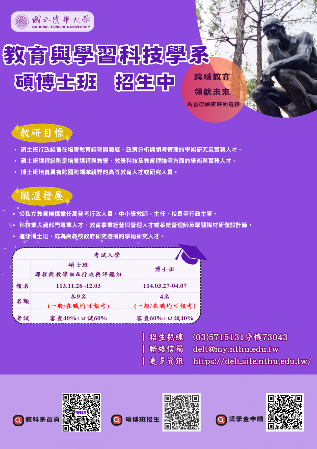 主旨: 檢送本校教育與學習科技學系(下稱本系)114學年度碩博士班考試入學招生訊息(詳如說明),敬請貴校惠予張貼公告並轉知所屬教師及行政人員踴躍報名,請查照。