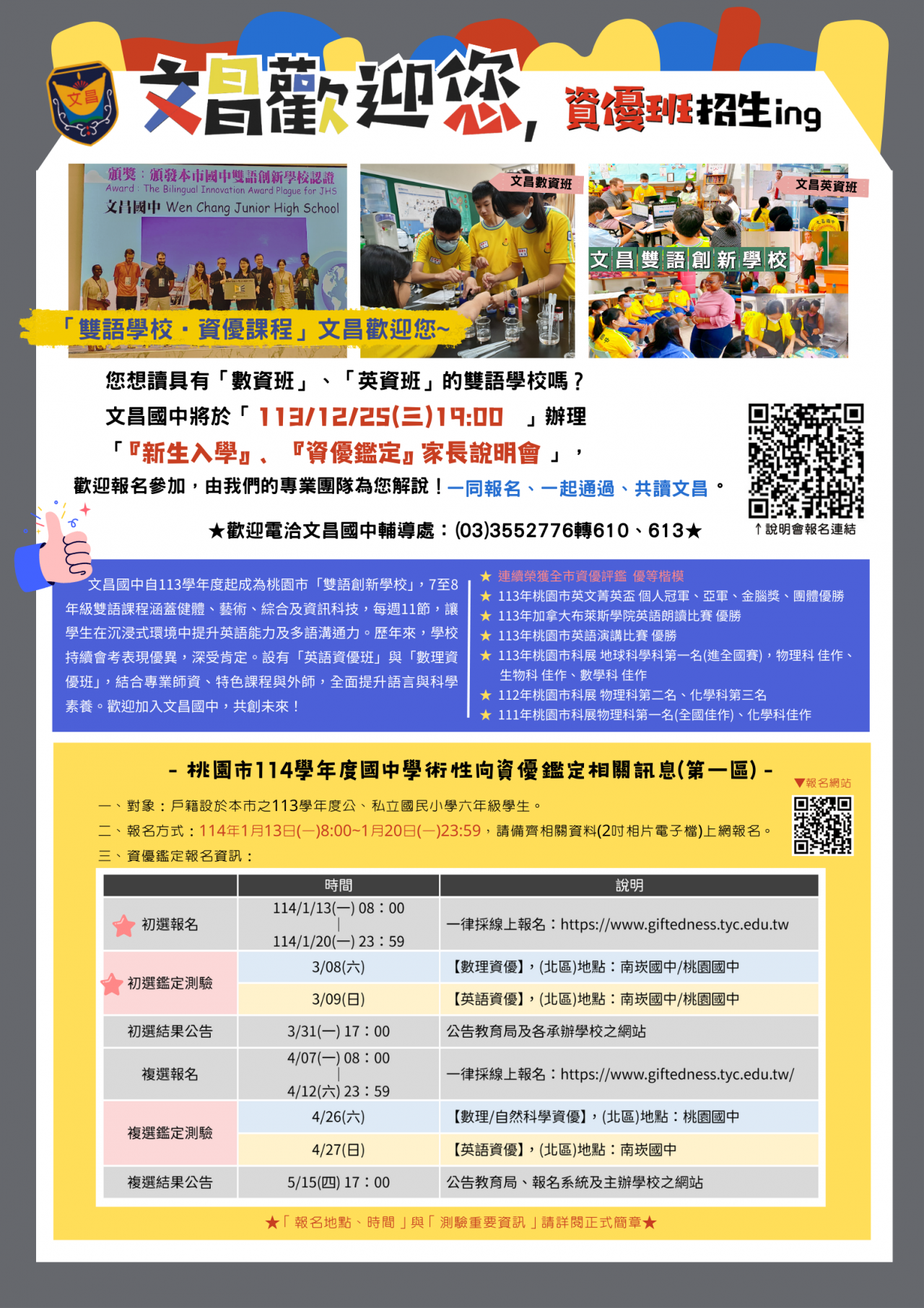 | 主旨: | 有關文昌國中辦理114學年度國民中學資賦優異學生鑑定家長說明會及數理資優營隊訊息,懇請貴校協助公告相關事宜。 |