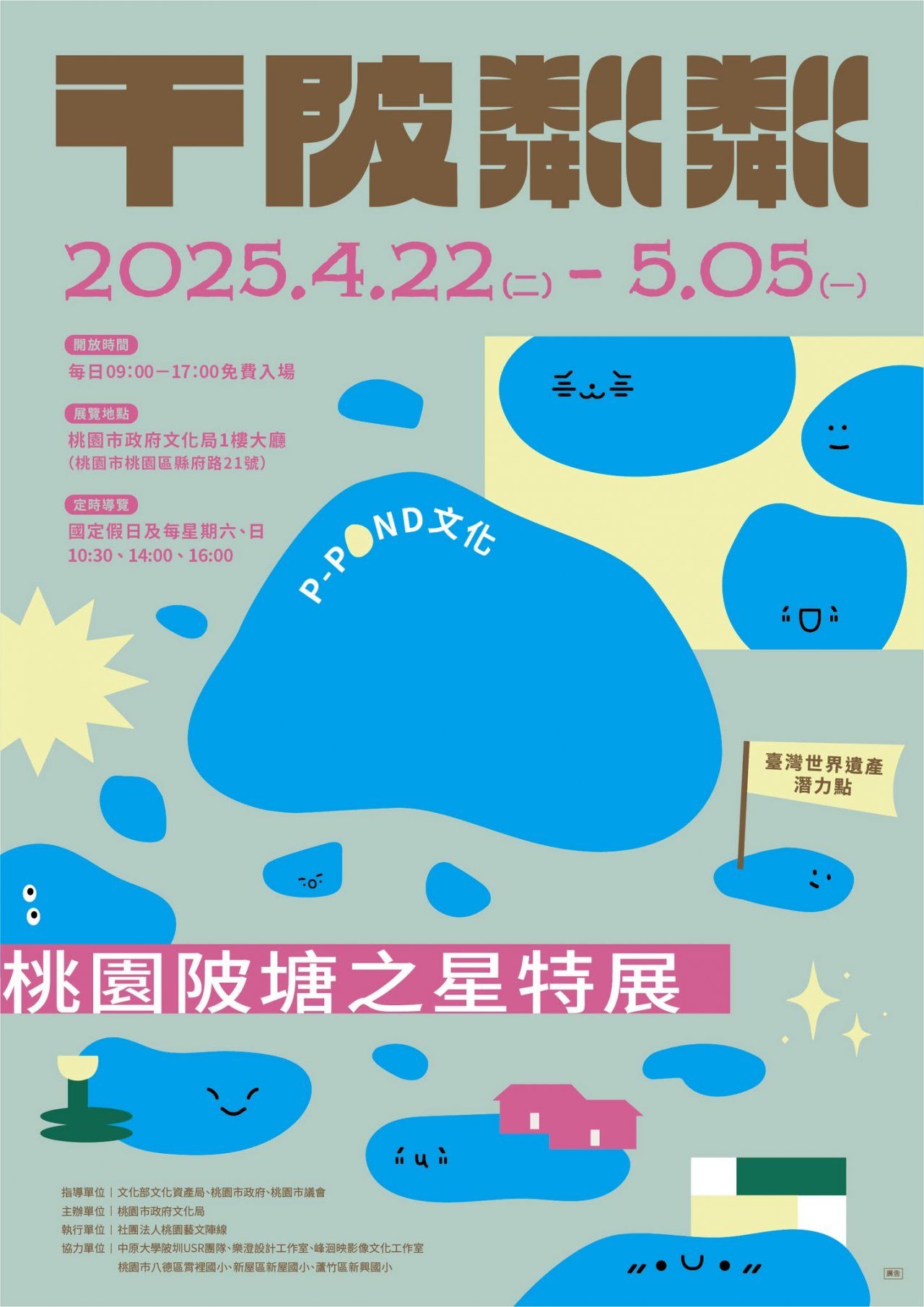 二、 | 旨揭展覽以「千陂粼粼-桃園陂塘之星」為題,象徵陂塘背後代表一個個亮眼且不可取代的故事。展覽將陂塘比喻為一個個明星,以明星引起的潮流、文化來討論陂塘的歷史脈絡、日常生活、產業發展及生態環境;呈現桃園各地區的陂塘故事,用追星的視角來了解陂塘各方面,如何產生不同的生活樣貌以及不能或缺的關鍵。 |
