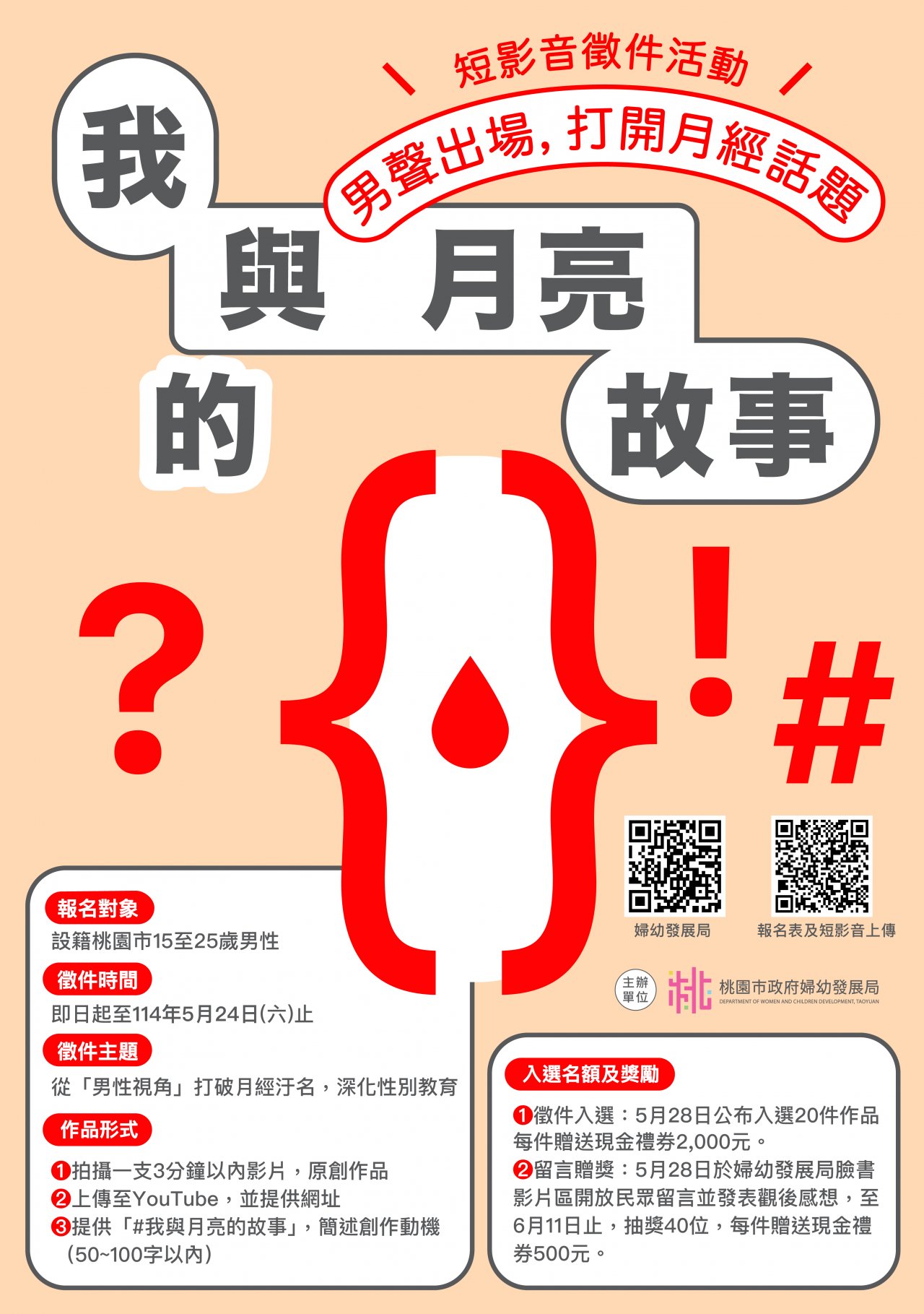 主旨: | 檢送本府婦幼發展局114年月經平權推廣行動計畫之「年輕男性短影音徵件活動」之海報及跑馬燈文字稿,請協助宣傳並轉知踴躍報名投稿,請查照。 |