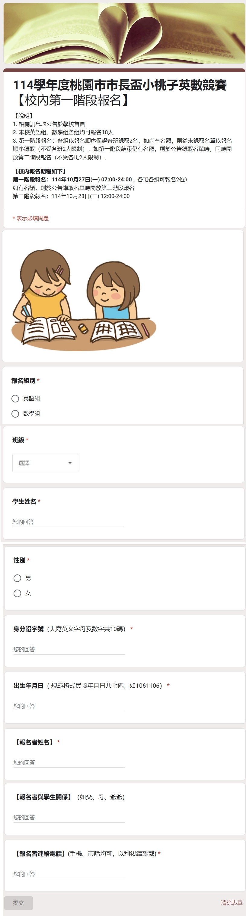 4. 比賽分為英語組及數學組,如二組均有意參賽,需報名二次(請考量參賽意願,決定報名順序)